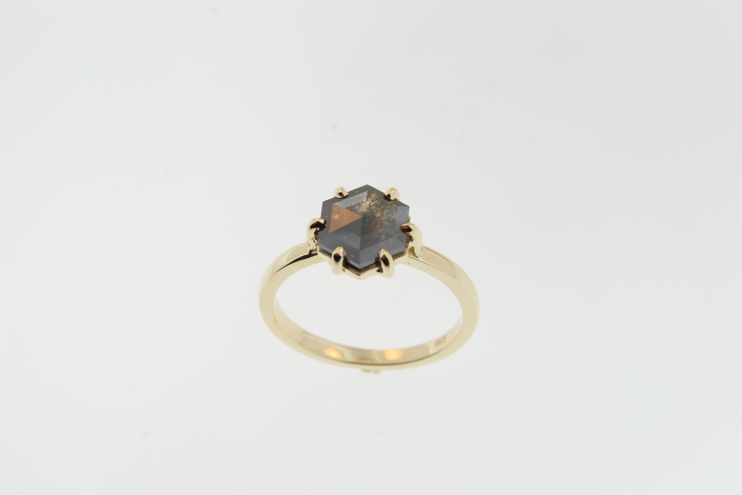 A 1.3 carat Rustic-cut Diamond ring. Set in 14k yellow gold, solitare style. The mysterious play of color on your finger as you move into various lighting with this ring is fascinating. Simple yet bold, this ring will get noticed everywhere you go!