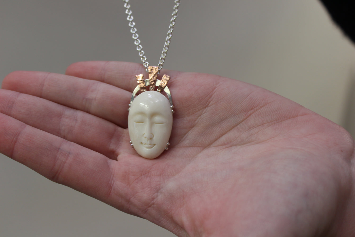 Practicing peace with an iconic meditation pendant. Fine carving in Bone, held delicately in recycled Sterling Silver with hammered copper accents.